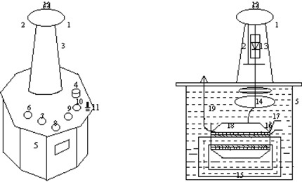 1-均壓球;2-硅堆短路桿;3-高壓套管;4-油閥;5-殼體;6、7-調整電壓輸入a、x端子;8、9-儀表測量E、F端子;10-高壓尾X端子;11-變壓器外殼接地端;12-高壓輸出A端子;13-高壓整流硅堆;14-內部均壓環;15-變壓器鐵芯;16-初級低壓繞組;17-測量儀表繞組;18-二次級高壓繞組;19-變壓器油。