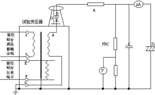 FRC- 阻容分壓器;V- 分壓器高壓表;uA- 微安表;D- 高壓整流硅堆。