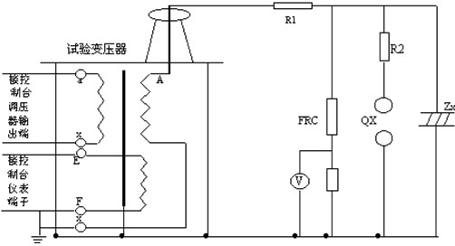 在試驗變壓器中:a、x為低壓輸入端;A、X 為高壓輸出端;E、F為儀表測量端。